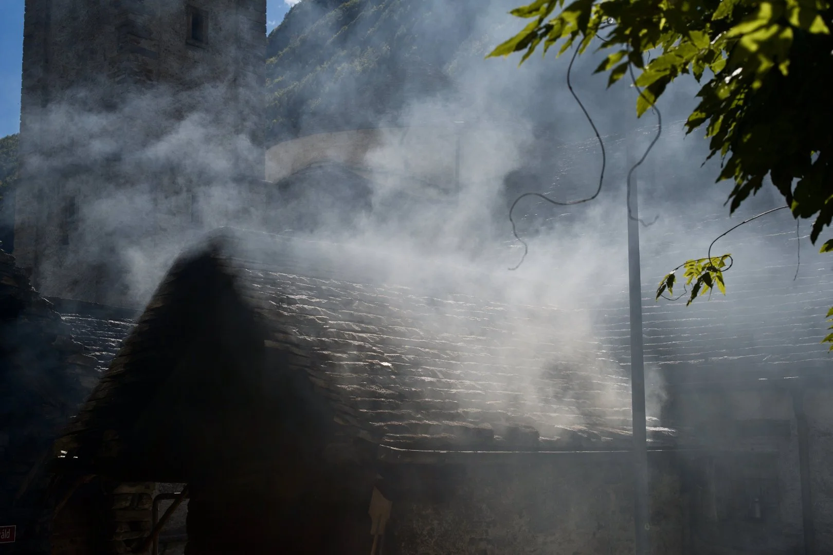 Rauch schlängelte sich, vom Wind verweht, durch das malerische Dorf Sonogno. In der Nähe der Dorfkirche lag der Duft von verbranntem Holz in der Luft. Bald entdeckte ich den alten Brotbackofen, aus dem frisch gebackene Brote entnommen und gleich auf einem Holzbrett verteilt wurden. Das Brot wurde direkt vor Ort zum Verkauf angeboten.