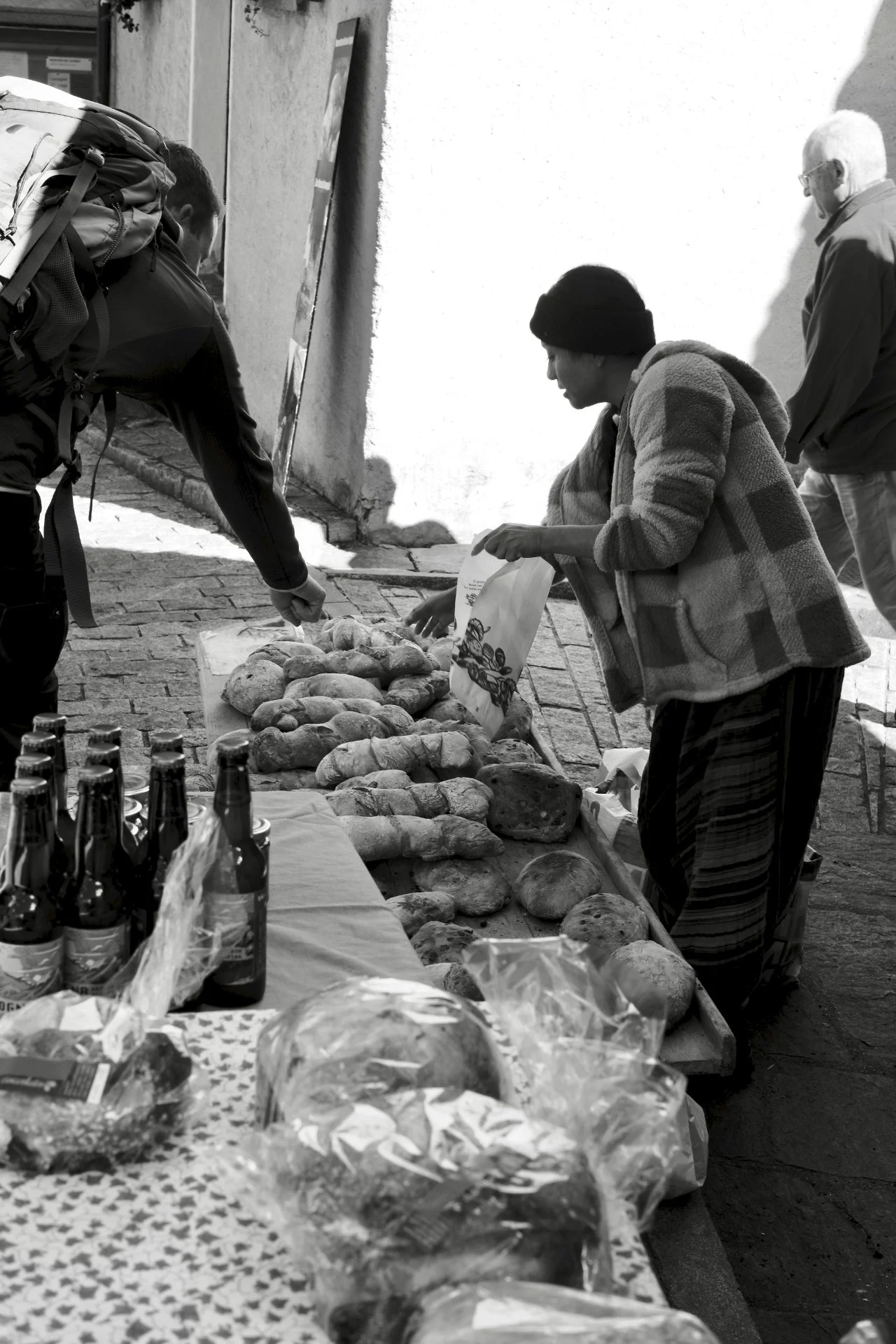 Die Brote wurden rasch weniger, doch der Nachschub liess nicht lange auf sich warten. Weitere Laibe wurden aus dem Ofen gefischt und auf das am Wegrand liegende Brett gelegt. Die Bäckerin, die zugleich auch Verkäuferin war, hatte allerhand zu tun.